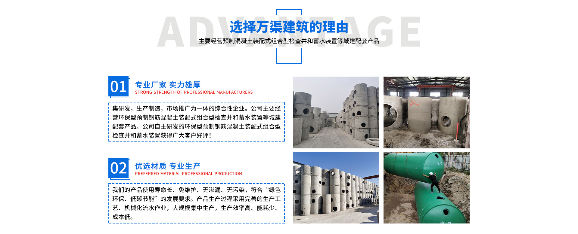 安徽萬渠建筑科技有限公司是集研發(fā),生產(chǎn)制造,市場推廣為一體的綜合性企業(yè)。公司主要經(jīng)營環(huán)保型預(yù)制鋼筋混凝土裝配式組合型檢查井和蓄水裝置等城建配套產(chǎn)品。產(chǎn)品生產(chǎn)過程采用獨特的生產(chǎn)工藝,機械化流水作業(yè)。產(chǎn)品大規(guī)模生產(chǎn),生產(chǎn)效率高,耗能少,成本低,產(chǎn)品使用壽命長、免維護、無滲漏、無污染,符合“綠色環(huán)保,低碳節(jié)能”的發(fā)展要求,是傳統(tǒng)磚砌井池的理想替代產(chǎn)品。